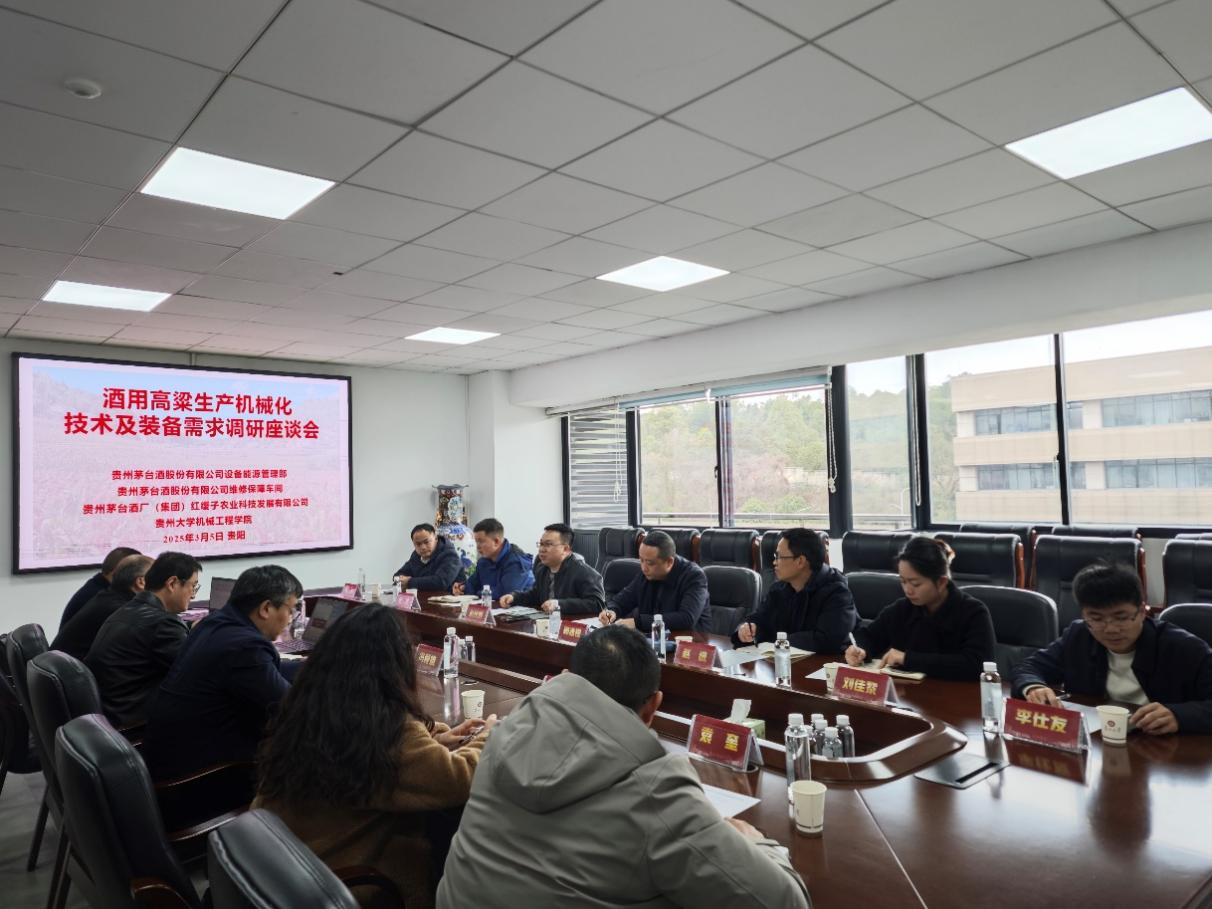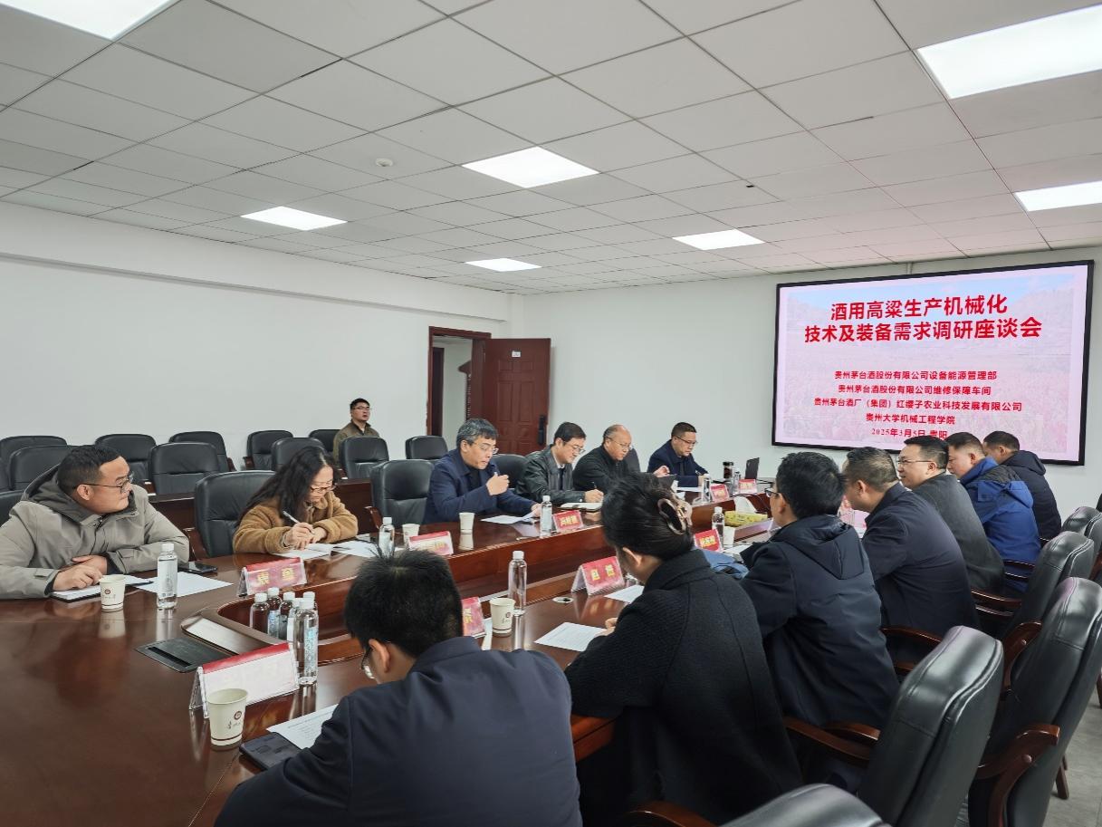 2025年3月5日下午,貴州大學(xué)機(jī)械工程學(xué)院與貴州茅臺酒股份有限公司調(diào)研座談會在貴州大學(xué)機(jī)械工程學(xué)院舉行,會議主題聚焦于酒用高粱生產(chǎn)機(jī)械化技術(shù)及裝備需求。貴州茅臺酒股份有限公司設(shè)備能源管理部、維修保障車間、貴州茅臺酒廠(集團(tuán))紅纓子農(nóng)業(yè)科技發(fā)展有限公司相關(guān)負(fù)責(zé)同志和技術(shù)人員,機(jī)械工程學(xué)院院長趙津教授、副院長唐正強(qiáng)教授、馮毅雄教授、張富貴教授、吳雪梅副教授、盧劍鋒副教授、袁奎高級實驗師等參加座談會。