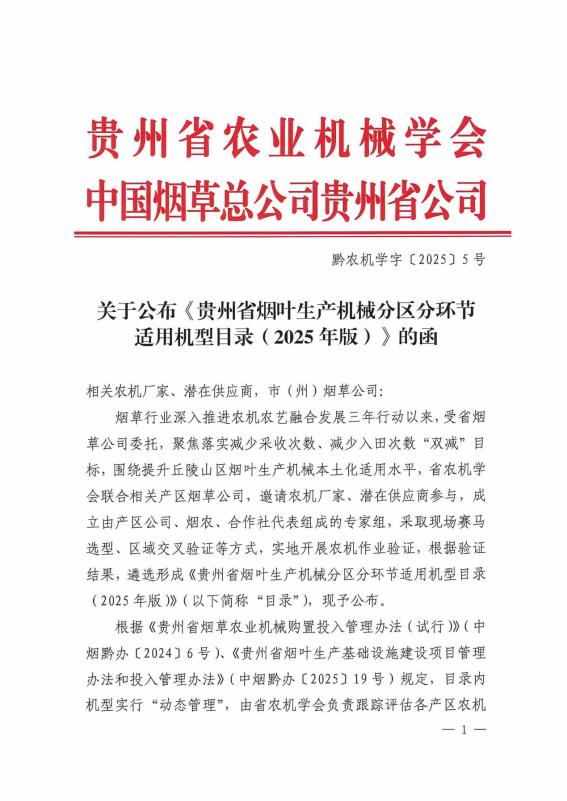近日,貴州省農(nóng)業(yè)機(jī)械學(xué)會攜手中國煙草總公司貴州省公司,共同發(fā)布了《貴州省煙葉生產(chǎn)機(jī)械分區(qū)分環(huán)節(jié)適用機(jī)型目錄(2025年版)》。我院張富貴教授領(lǐng)銜的山地智能農(nóng)機(jī)團(tuán)隊成員參與其中,歷時半年完成。